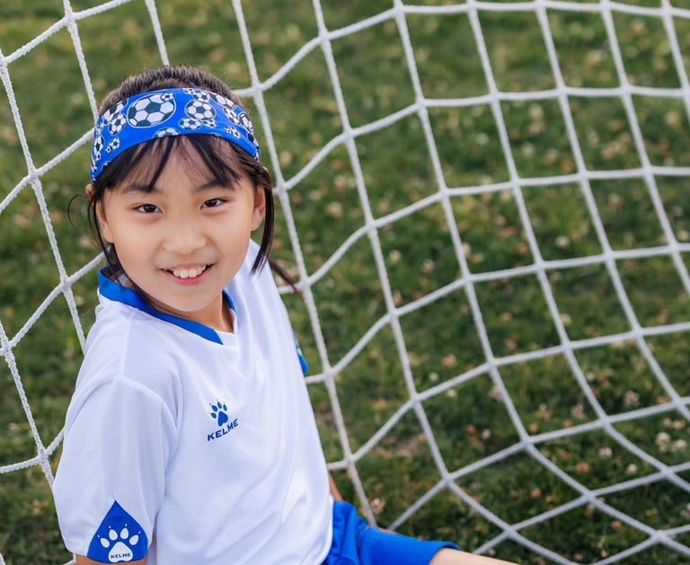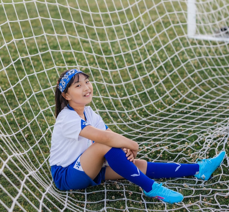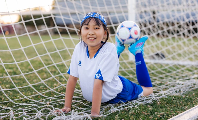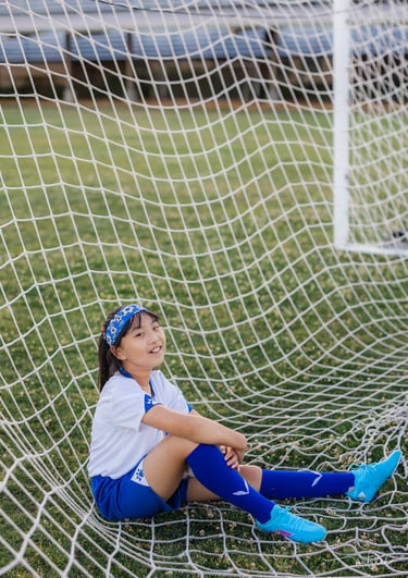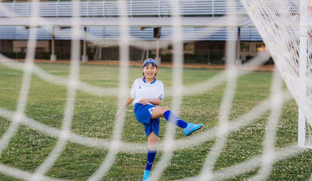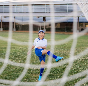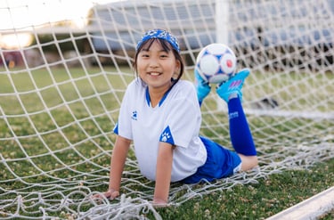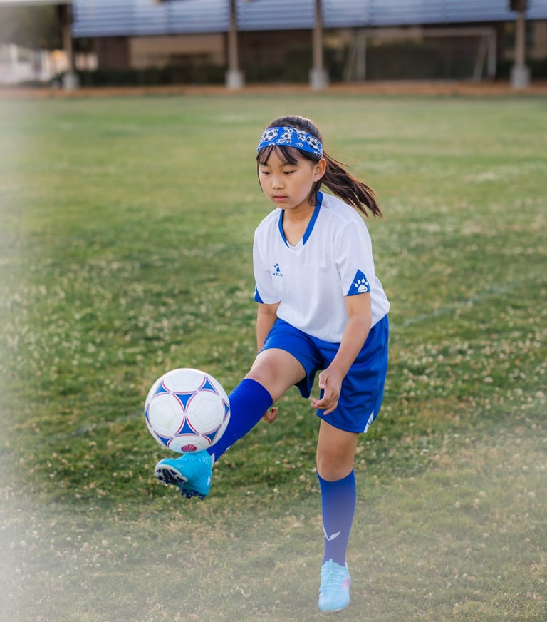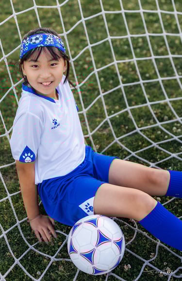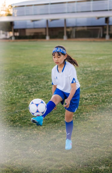 An outdoor sports portrait session featuring a young girl playing soccer on her school playground, capturing energy, movement, and the joy of youth.